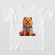 Illustration de style cartoon d'un chien duveteux et joyeux. Le chien a un pelage orange vif avec une crinière touffue et une expression amicale, montrant un large sourire heureux. Ses yeux sont grands et expressifs, contribuant à son attitude ludique. Le chien est assis confortablement, ses pattes tendues vers l'avant, et porte un bandana bleu orné de motifs de fleurs blanches autour du cou. L'ambiance générale de l'illustration est mignonne et invitante, en faisant une représentation chaleureuse d'un chien. Le fond est blanc uni, ce qui accentue les couleurs vives du chien.