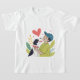 Un T-shirt gai et aimant avec un jeune garçon en chemise verte et un casquette de baseball bleu serrant son chien noir et blanc avec un collier rouge. Un grand coeur rouge flotte au-dessus d'eux, symbolisant leur lien fort. Contre un arrière - plan de lavande douce aux feuilles ludiques, aux points et aux étoiles étincelantes, ce design chaleureux est parfait pour les garçons qui aiment les chiens et les oeuvres d'art mignonnes et affectueuses.