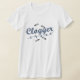 Ce joli T-shirt pour des danseurs d'entrave comporte le mot cursif "Clogger" dans le bleu avec une rangée de cinq chiffres minuscules de bâton de danse. Il a également quatre copies de chaussure avec des robinets sur eux. C'est une grande manière de montrer votre amour d'obstruer. En outre disponible dans le pourpre.