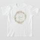This T-shirt has a wreath of pink flowers in a wreath with a pink striped background with text that says "Christ the Lord is Risen."