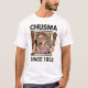 L'Humour latin T Shirt dépeint la grand-mère tchusma hurlant depuis la fenêtre de son immeuble d'appartements. Au fond, le petit garçon dépasse la terrible chancelle volante !