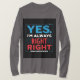 Un design d'enseignant de mathématiques ludique et audacieux avec l'expression "OUI. J'AI TOUJOURS RAISON - FUNNY MATH TEACHER" en typographie bleue, blanche et rouge éclatante. Parfait pour les éducateurs qui veulent montrer leur amour des mathématiques et de l'humour. Idéal pour les T-shirts, les tasses et les accessoires scolaires.