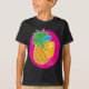 Un ananas avec un dessus vert, est sur un arrière - plan cyan. Dans le premier plan, il y a un cocktail d'ananas dans un verre refoulé grand, avec une cale de citron et un parapluie bleu minuscule.