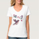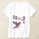C'est un T-shirt féminin "Un d'un genre" unique. Il présente un colibri coloré sirotant le nectar de belles fleurs roses et violettes sur le devant... et des fleurs roses et violettes sur le dos! Peinture d'art original par l'artiste Kerry Miller.