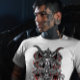Un tee-shirt de style gothique sombre avec un grand crâne de chèvre avec un crâne humain de chaque côté. Il y a un pentagramme en bas et du sang qui coule de toute l'image.