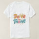 Ce t-shirt dynamique présente l'expression motivante "Drive to Thrive" dans une police vibrante et multicolore. Le design intègre un arrière - plan audacieux et abstrait aux formes et aux couleurs contrastées, symbolisant l'énergie et la détermination nécessaires pour atteindre des objectifs personnels. L'impression générale du t-shirt est inspirante et stimulante, ce qui en fait un choix parfait pour les personnes à la recherche d'une pièce de déclaration qui encourage l'ambition et la persévérance.