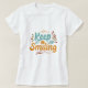 Le t-shirt affiche un design dynamique avec le message "KEEP SMILING" affiché dans une police multicolore audacieuse. Les formes de Whimsical fleurissent comme les étoiles, les griffes et les formes géométriques dans différentes teintes vives entourent le texte, créant une composition joyeuse et dynamique.