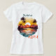 Ce t-shirt d'été est l'image d'un artiste d'un brillant coucher de soleil sur un lagon. La lumière du soleil se reflète dans l'eau, encadrée de palmiers. Le texte en haut et en bas de l'image dit "Vous m'avez eu à ALOHA".