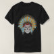Cette chemise distinctive comporte le rendu d'un artiste d'un crâne blanc de grimacerie portant une coiffe de Natif américain de plume de bleu et d'or.
