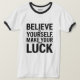 Illustration vectorielle d'un T-shirt avec la citation motivationnelle "Croyez en vous, faites votre propre chance". La citation est écrite en caractères gras, en lettres capitalisées, avec chaque mot sur une nouvelle ligne. L'arrière - plan est blanc.
