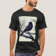 Tee in a black-and-white illustration featuring a sleek black crow perched on a gnarled, leafless branch. The bird's detailed feathers contrast sharply with the stark, skeletal tree limbs, creating a dramatic composition.