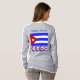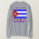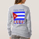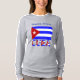 T-shirt féminin à manches longues avec le drapeau cubain et le mot CUBA sous le drapeau dans les mêmes couleurs bleu, rouge et blanc. Utilise des bandes bleu clair. Ci-dessus est un endroit pour un nom, en lettres bleues foncées, pour personnaliser le look ou créer un cadeau personnalisé. Amusant à porter lors d'une réunion de famille cubaine. Modifiez la police et la couleur du nom avec l'option "modifier la conception".