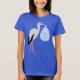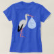 Ce t-shirt mignon présente une image graphique d'une mignonne cigogne blanche avec des plumes de queue noire, accrochée à un paquet de couvertures bleu pâle. Il y a du texte bleu sur le paquet qui dit "Baby Boy". Ce design est parfait pour célébrer un bébé garçon.
