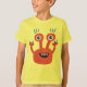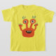 Un mignon T-shirt enfant monstre avec une jolie illustration représentant un personnage de dessin animé de couleur orange avec des ongles et des cils bleus souriant joyeusement en montrant ses dents. Cette drôle d'illustration monstre a des couleurs chaudes jaune et orange.