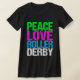 Roller cadeau fille avec les mots Peace Love Roller Derby en cool vert, rose, bleu et blanc en caractères désespérés sur un arrière - plan turquoise créant un look vintage amusant pour quelqu'un qui vit pour le patinage. Commandez-les pour tous vos joueurs d'équipe !