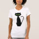 Un chat noir aux yeux verts assis droit. Ce design semble vraiment efficace sur ce T-shirt féminin