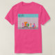 Vous êtes invité à l'événement social de l'année avec ce projet de T-shirt Atomic Palm Springs Stewardess Party. Joignez-vous à ces trois hôtesses de l'air vintages qui rivalisent avec les compagnies aériennes pour accéder à leur kitschy 1960's breezy block hotel. L'un des clochards fabuleusement accrochés dans un uniforme rose chaud rétro tient la porte orange tandis que l'autre lutte avec les bagages des femmes. Des palmiers turquoises s'élancent dans l'arrière - plan d'un ciel turquoise improbable alors qu'un jetliner survole. Ce design vous fera dire : "Sur votre marque, jet set, allez !"