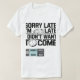 Cette conception amusante et sarcastique comprend l'expression "Désolé, je suis en retard, je ne voulais pas venir" avec une illustration de l'horloge fondue ou cassée, symbolisant la latence et la réticence. Le design mélange le bloc gras