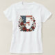 This initial 'E' is special for its classic Americana aesthetic combined with bold floral elements. The letter form is filled with a cracked, vintage American flag pattern, giving it a unique, rustic feel. It is beautifully framed by vibrant red roses, white daisies, and patriotic heart accents. This highly detailed graphic is ideal for personalized patriotic gifts, Independence Day apparel, or vintage graphic prints.