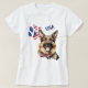 La caractéristique de cette chemise unique est l'image aquarelle d'un beau chien berger allemand portant une cravate arc sur le thème du drapeau. À côté de l'image de chien est une étoile et rayures empreinte de patte avec "USA" en bleu marine en dessous.