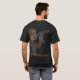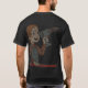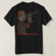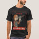 Un homme modèle un t-shirt noir avec un dessin animé d'un enfant sinistre dans des couloirs tenant une grande perceuse, bordé d'un rectangle rouge avec les avertissements "UTILISER AVEC LES ENFANTS SOINS" et "LES OUTILS PEUVENT ÊTRE CRUELS".