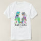 Dégustez vos invités mariages avec ce t-shirt mariage coloré à thème dinosaure psychédélique avec une mariée en T-Rex et un dinosaure de marié. Facile à customiser avec les noms des mariés et des mariés et la date du mariage. Fun T-Rex marié préhistorique et des illustrations de dino marié en bleu vert rose violet jaune et orange avec typographie moderne. Oeuvre originale unique de l'artiste Catherine Sweetman