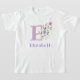 Initial & Nom avec Floral Design sur un t-shirt. Le design présente le Monogramme & Nom du destinataire avec Fleurs dans un style pastel couleur eau. Initial est la lettre E. Exemple montre Elizabeth. Design floral.