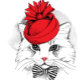 Illustration d'un chat blanc portant un casquette rouge et une cravate arc rayé noir et blanc, le chat a un nez rose et des yeux noirs, l'arrière - plan est une texture aquarelle, le style est un mélange de dessin à l'encre et de peinture à l'aquarelle.