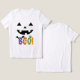 Un t-shirt blanc avec un design d'Halloween ludique et festif. Au centre se trouve un sourire orange jack-o’-lanterne avec des triangles noirs découpés pour les yeux et le nez. Ci-dessous se trouve le mot "BOO !" en grandes lettres ; chaque personnage décoré de façon unique pour représenter différents symboles d'Halloween : une aile de chauve-souris pour "B", des visages fantômes éffrayants pour "O", et un motif citrouille orange remplissant un autre "O". Le design saisit l'essence du plaisir d'Halloween et pourrait être porté dans le cadre d'une tenue de vacances décontractée ou dans un costume simple.