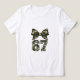 Unleash your inner tough and stylish side with this unique 'Camo Bow 67' t-shirt, a perfect blend of feminine elegance and rugged military-inspired aesthetics for 2025! This eye-catching design features a large, beautifully rendered camouflage-patterned bow positioned directly above the bold number '67' in a classic varsity block font.