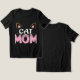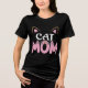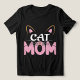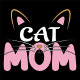A playful t-shirt design featuring the words 'CAT MOM' in bold, vibrant typography. The letters are adorned with cute cat ears and whiskers, creating a whimsical and fun look. The shirt is set against a neutral background, emphasizing the striking black fabric. The overall style is cheerful and inviting, perfect for cat lovers. The design captures a lighthearted mood, making it an ideal gift for any proud cat parent.