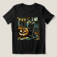Chemise Halloween. Chat noir assis sur un porche avant à côté d'un citrouille sculpté avec une pleine lune dans l'arrière - plan.