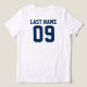 T-shirt de football avant et arrière personnalisées pour maman - montré en Design blanc pour maman de football dispose d'un casque de football avec texte sportif qui peut être customisé pour le nom de l'équipe, le nom de famille du fils, et son numéro de maillot. Les couleurs gris argenté et bleu marine peuvent être customisées.