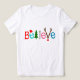 Ce design festif présente le texte multicolore "Believe" avec un chapeau de Père Noël, un arbre de Noël, des bois et un nez rouge comme éléments décoratifs. #Noël #croyez #fêtes #saisonnière #fête #mode #style #fun