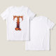 This is a festive, spooky illustration featuring an ornate, glowing orange letter 'T' that looks like an ancient, horned pillar, decorated with autumn leaves and vines. It is centered above two glowing, grinning jack-o'-lanterns nestled in a pile of fallen leaves against a dark, hazy teal background.