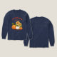 T-shirt à manches longues de saison d'automne en bleu foncé avec design citrouille et tournesols. Customisez avec un nom de ferme, ou homestead, qui tourne à travers le sommet. Deux lignes supplémentaires peuvent être ajoutées avec l'adresse de la ferme, ou d'autres informations. Les citrouilles orange, et un citrouille blanc, ont deux tournesols derrière eux. Le texte est rouge-orange vif et une ligne bouclée amusante se trouve sous l'ensemble du design. Choisissez n'importe quel type de vêtements dans presque n'importe quelle couleur.
