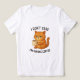 This is a humorous cartoon illustration featuring an orange tabby cat with a grumpy expression, holding a white mug of coffee. The text "I DON'T CARE" is written above the cat and "I'M HAVING COFFEE" below it, conveying a relatable message about prioritizing one's morning coffee over everything else.