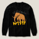 L'image présente une scène visuelle humoristique et inattendue avec un **grand mammouth brun** devant une ligne d'horizon de la ville **moderne*, rendu dans des contours blancs simples. Sous le mammouth, en gros caractères jaunes gras, l'expression **"WTF ? !"**, qui implique choc ou confusion. Ajoutant à l'humour, il y a **de minuscules rats noirs** escalade sur et autour du texte et mammouth, créant un contraste de taille et une absurdité dans la situation. La combinaison de **préhistorique et de *** urbain avec **typographie de type bande dessinée** et **appariement animal stupide** donne à la conception une ambiance décalée et digne d'un mème.