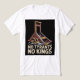 This bold, graphic design features a stark illustration of a wooden guillotine set against a black background. At the base of the structure, two ornate crowns—one large and elaborate, the other smaller—lie discarded and broken amidst scattered rubble and gold coins. Below the imagery, the defiant, distressed-style text reads: "NO TYRANTS NO KINGS."