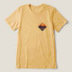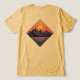 Cette illustration numérique capture une chaîne de montagnes sereine encadrée dans une bordure en forme de diamant. La scène représente des sommets pourpres déchiquetés sur fond d'un ciel de coucher de soleil orange et rose vibrant, avec un grand soleil doré partiellement visible derrière les montagnes. En dessous de la chaîne, une étendue d'eau calme reflète les teintes chaudes du ciel, rendues avec des lignes texturées qui suggèrent de légères ondulations. L'ensemble de l'œuvre utilise un style artistique monoline avec une palette de couleurs vintage, ce qui la rend adaptée à une utilisation en tant qu'autocollant, badge ou décoration murale moderne.