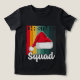 Le T-shirt Festive de Noël rétro Squad Santa Hat Festive Girl présente un arrière - plan de style rétro avec le texte "Christmas Squad" en typographie colorée avec un chapeau de Père Noël au centre. Conçu par Evco Holidays www.zazzle.com/store/evcoholidays