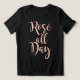Design de chemise féminine "Rosé All Day", noir et élégant, avec écriture de script moderne couleur or rose.