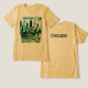 T-shirt graphique avec la ligne d'horizon de Chicago Illinois. Noir aux couleurs bleu et vert. La ligne d'horizon de Chicago est sur le devant de cette chemise tricolore. Le dos a "CHICAGO". Utilisez le modèle pour modifier le texte au verso ou laisser tel quel. Grand t-shirt pour hommes, femmes et enfants.