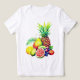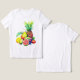 Tee in a collage of colorful tropical fruits including pineapple, papaya, mango, gogi berries, kiwi, and lime, with a tropical theme of rich textures and lush foliage.