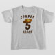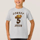 Le design affiche le nom de l'enfant sous forme d'arc en lettres marron en haut. Le nom de l'enfant apparaît ci-dessous. Le design central est constitué de l'âge de l'enfant avec un casquette cowboy au sommet du numéro. Tout le texte est brun foncé. Parfait pour une fête d'anniversaire sur le thème de l'Occident.