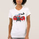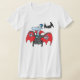 Cette conception est dracula et une chauve-souris. Dracula a son cap ouvert et il y a une chauve-souris qui vole autour. Cette conception de dracula et de chauve-souris a l'air superbe sur ce T-shirt féminin