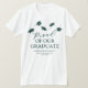T-shirt Green & White Graduation avec des casquettes en mortier en chute libre, le texte "fier de notre diplômé", le nom du grade, de l'école ou du collège, et l'année de classe.