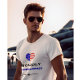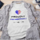 Coeur avec un drapeau américain design au sommet du design. "Fièrement" est écrit ci-dessous en caractères gras et noirs, avec "Pro-Démocratie" écrit en caractères gras et bleus. Sous qui est une petite étoile noire avec des lignes de chaque côté. Disponible en tailles masculines ou féminines et dans différents styles.