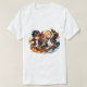 Vibrant anime-inspired duo on a blazing skateboard, split fire and ice palette, dynamic action scene, ideal for bold streetwear and gamer apparel.
