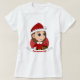 T-shirt féminin avec l'illustration d'une jolie fille souriante et joyeux aux cheveux longs bruns, elle porte le costume rouge et blanc du Père Noël et tient un cadeau; avec texte modifiable modèle pour votre nom ou message, Noël design